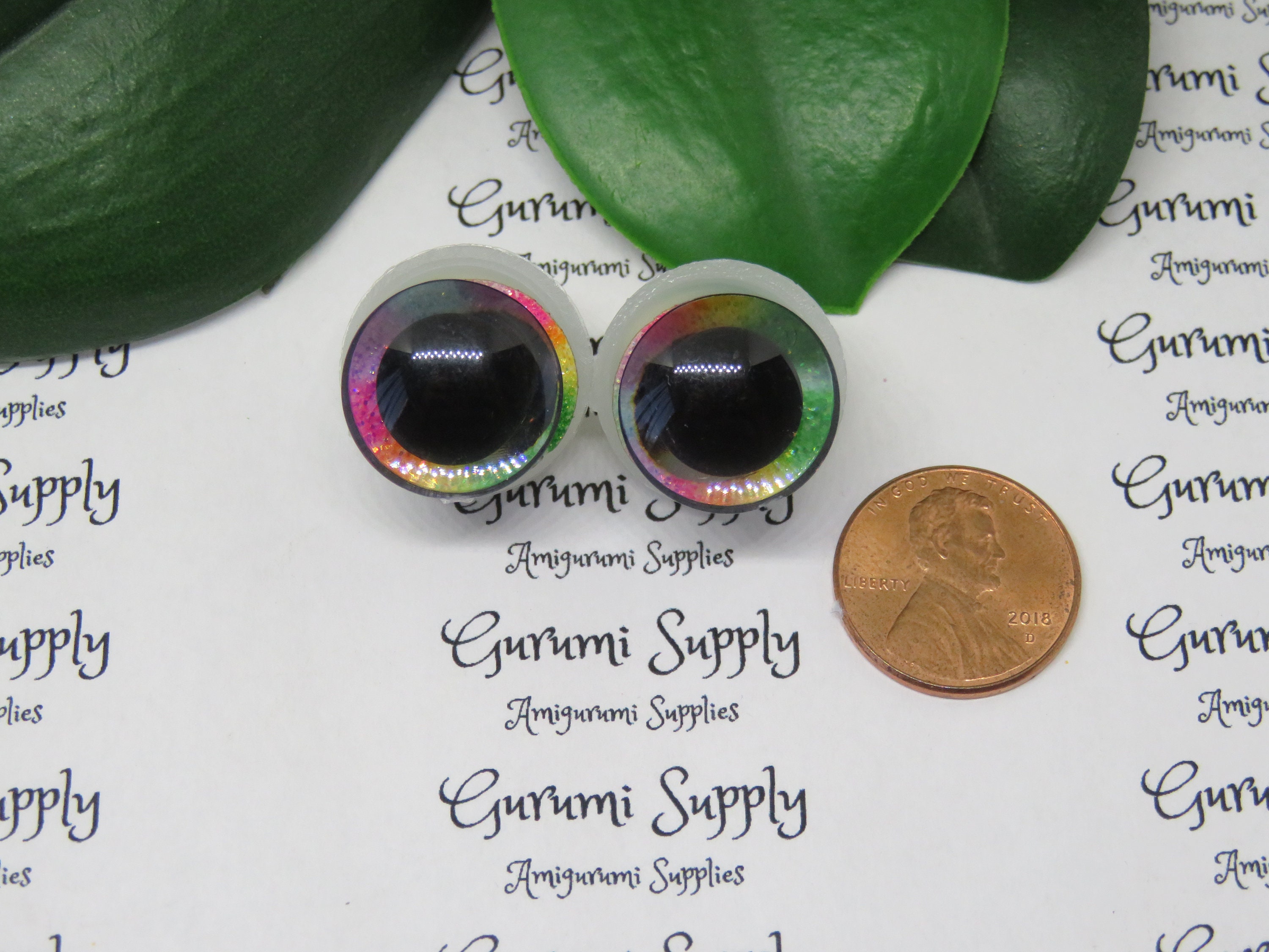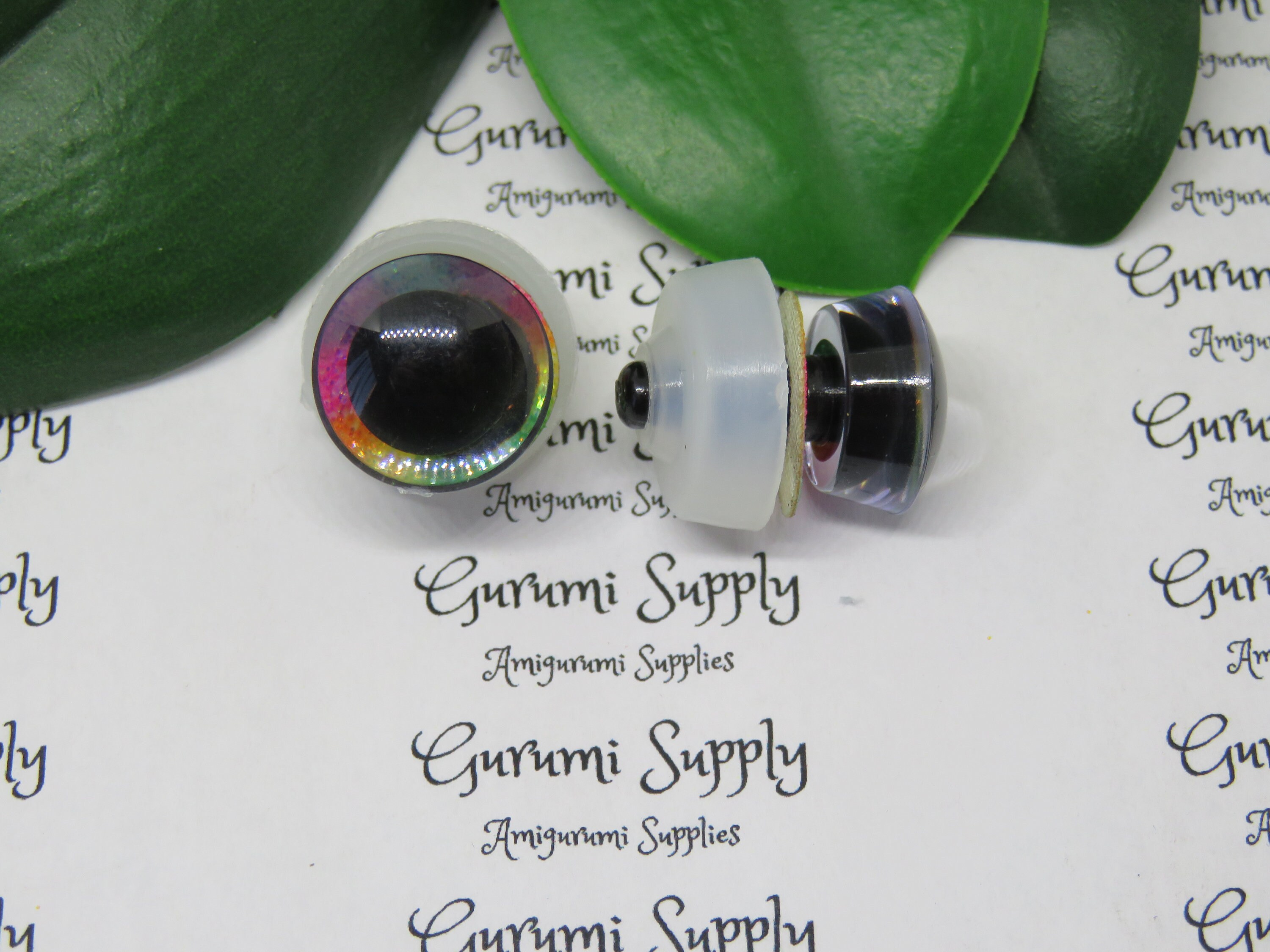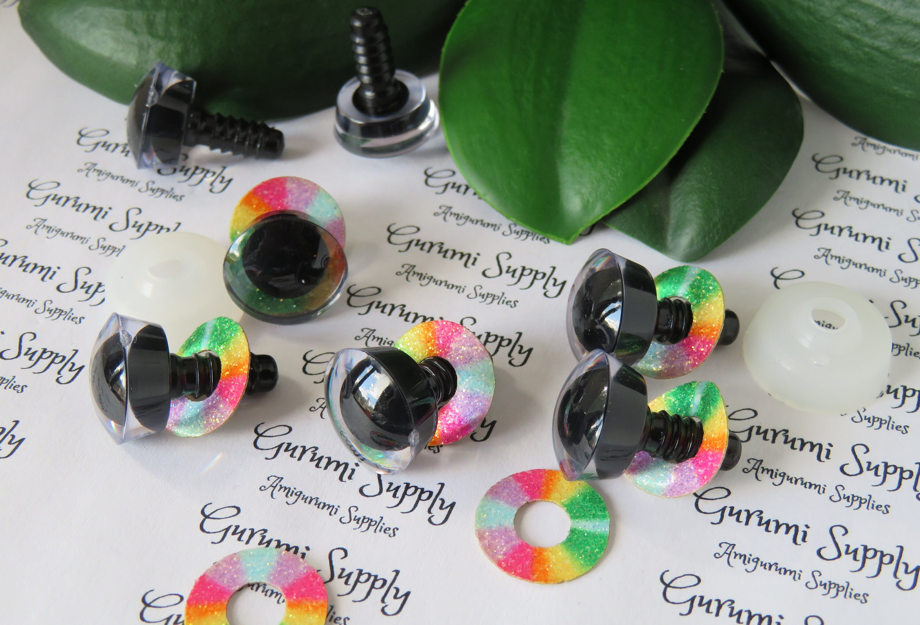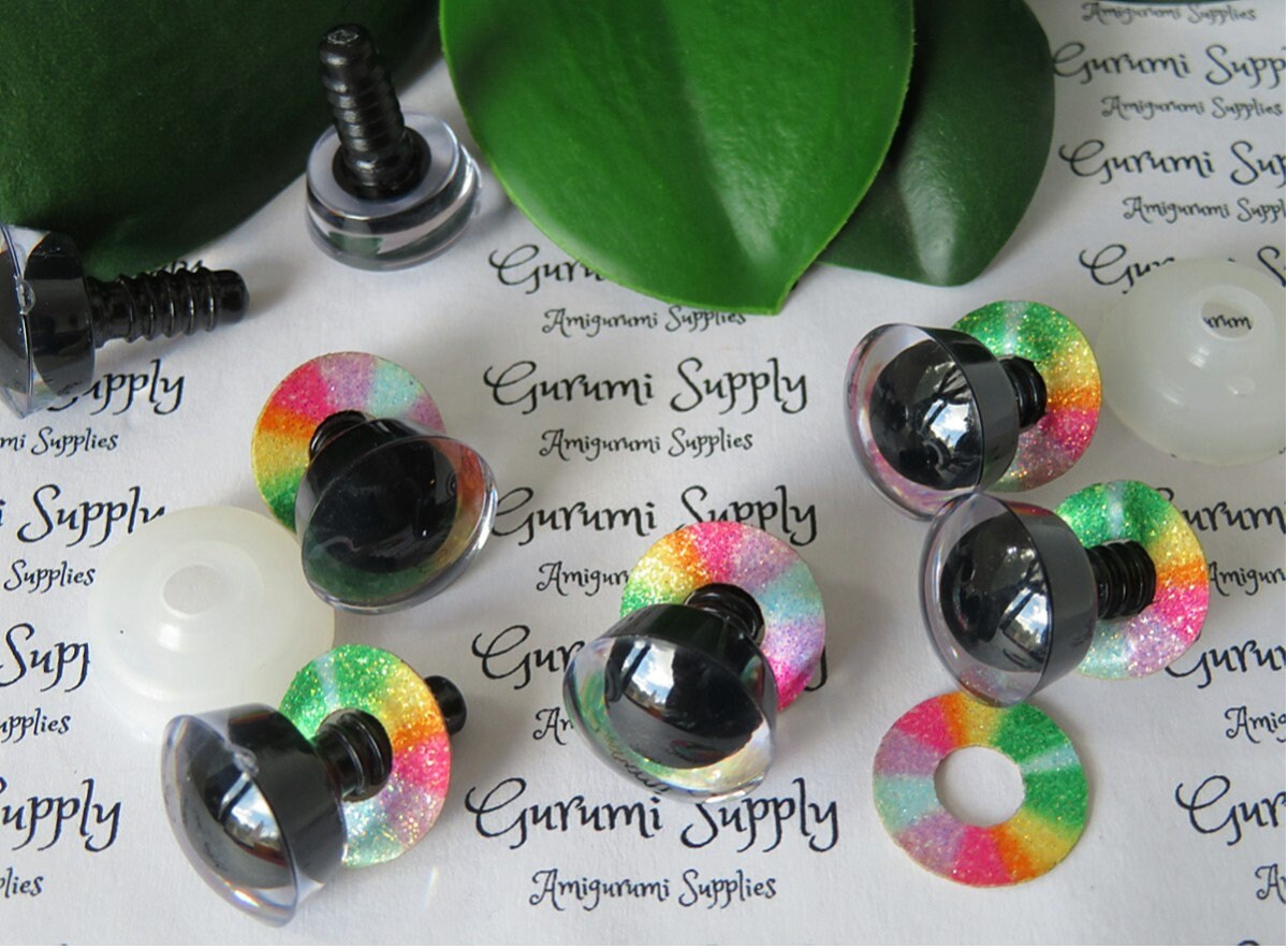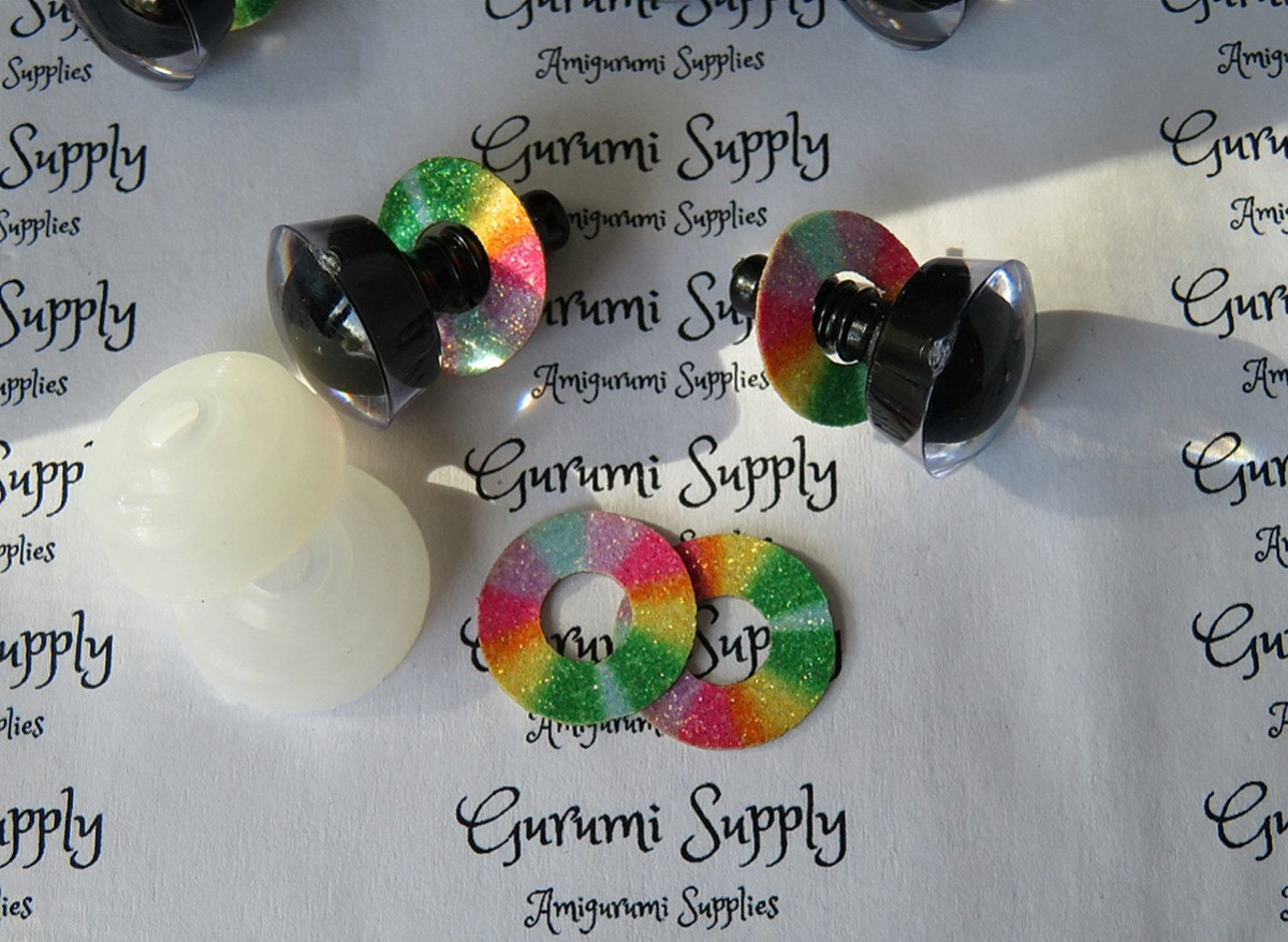 These glossy finished plastic safety eyes have a rainbow (style2) glitter non-woven slip iris backing and black pupil color with a shank back fitted for a washer to hold in place.