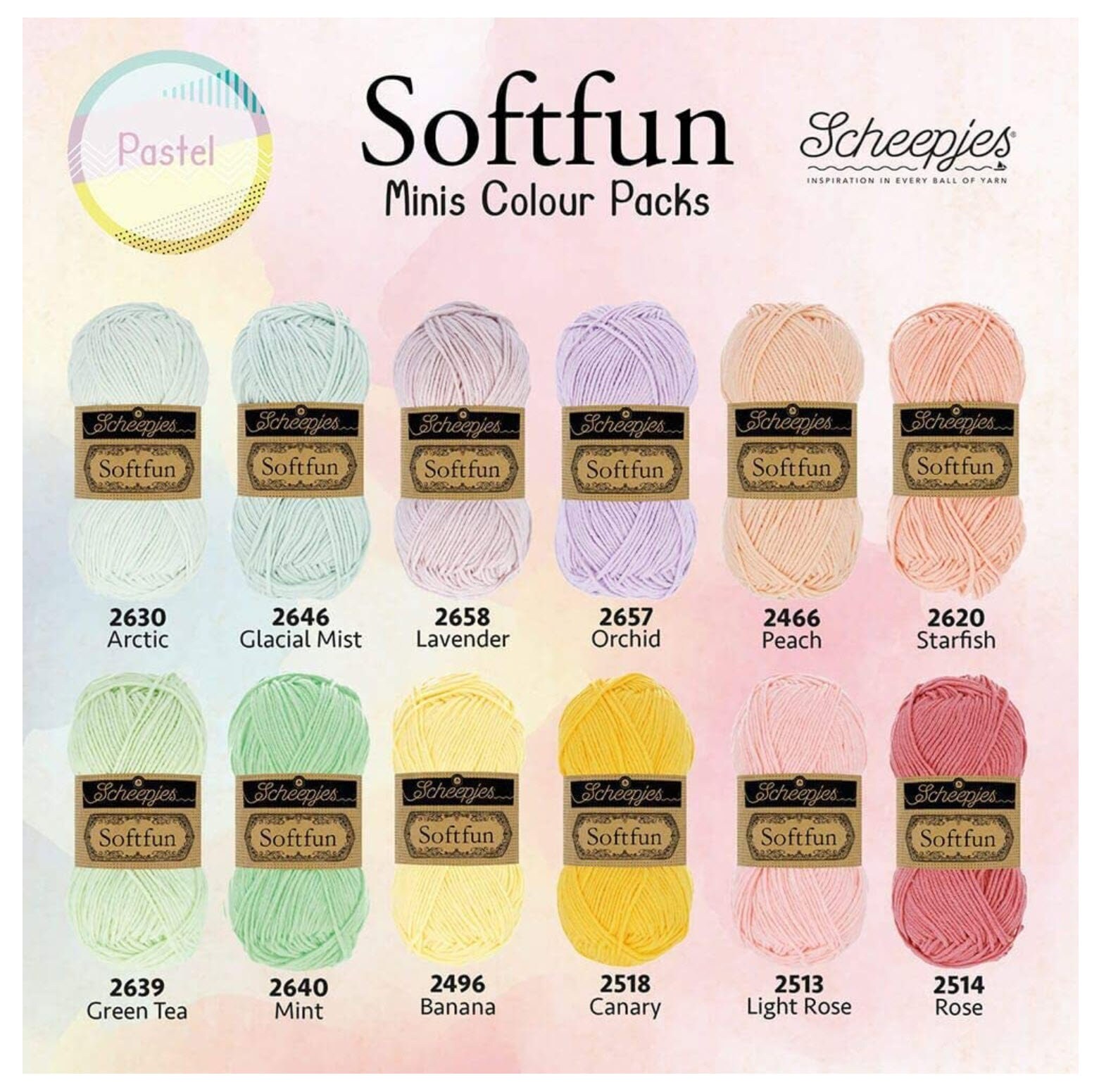 The Scheepjes Softfun Minis Colour Packs each contain 12 adorable 20g 'Cutie Pie' balls in a colour palette of carefully selected Softfun colours! With just one Softfun Minis Colour Pack, easily create smaller colourful or Fair Isle projects or combine several Colour Packs to create a Granny Square blanket exploding with colour!